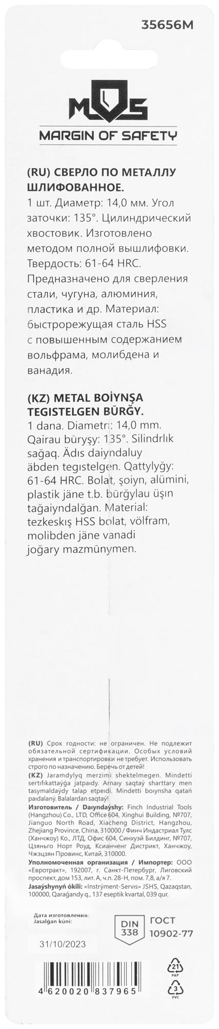 Сверло изготовлено из быстрорежущей стали с повышенным содержанием вольфрама, молибдена и ванадия, что гарантирует долговечность и устойчивость к износу. Цилиндрический хвостовик и полная вышлифовка по стандарту DIN338 обеспечивают надежное крепление и минимальную вибрацию в процессе работы.