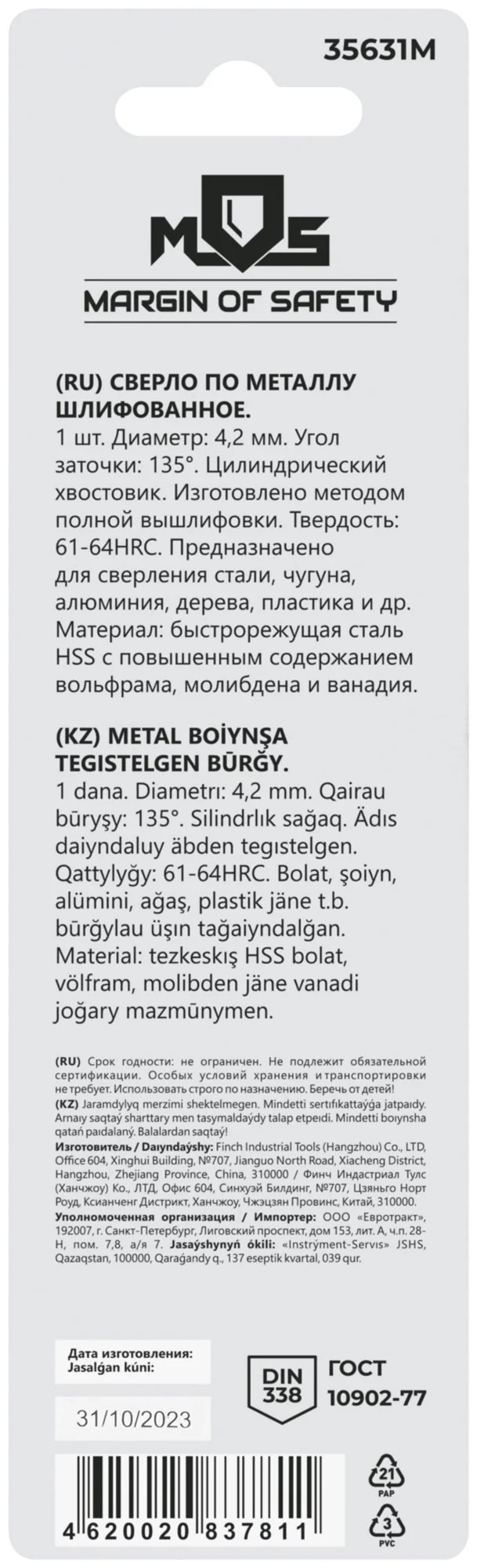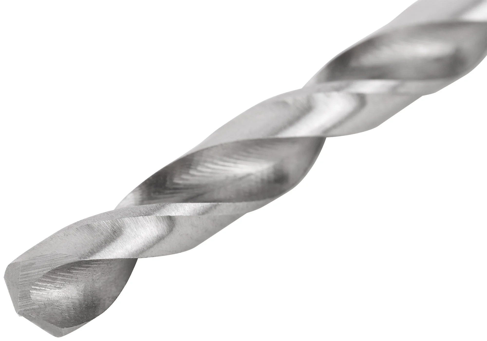 Сверло изготовлено из быстрорежущей стали с добавлением вольфрама, молибдена и ванадия, что обеспечивает высокую твердость и долговечность. Угол заточки 135° и цилиндрический хвостовик делают это сверло идеальным для работы на высоких оборотах.