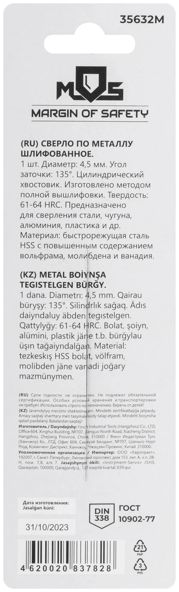 Сверло по металлу HSS шлифованное 4,5 x 80 мм с углом заточки 135°