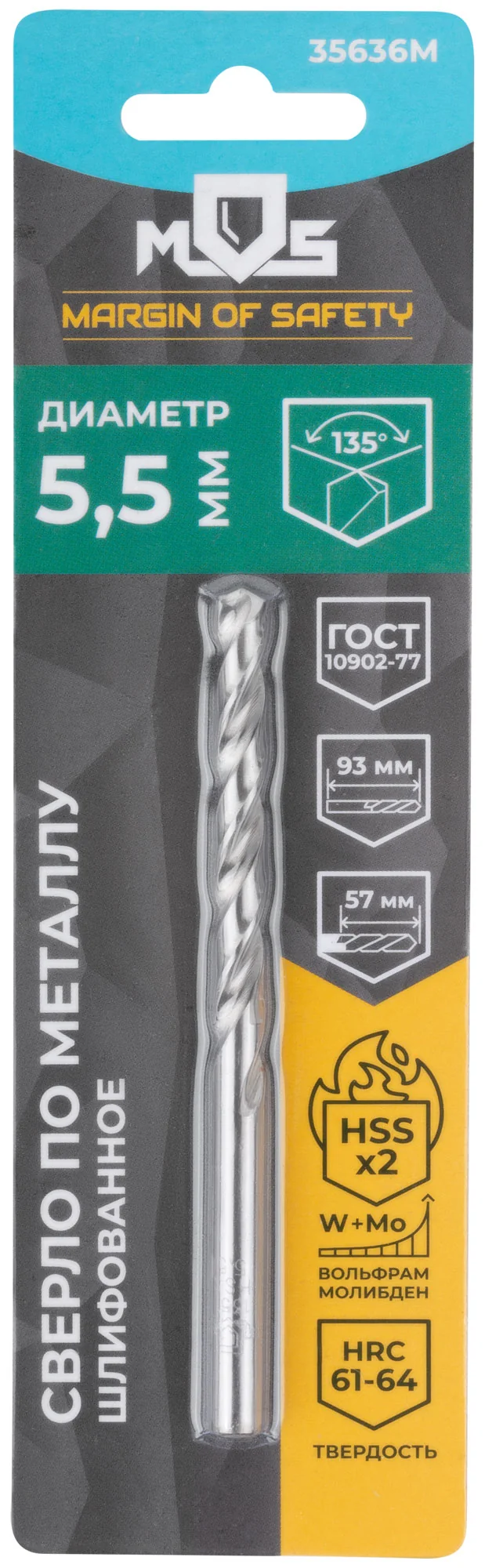 Сверло по металлу HSS шлифованное 5,5 x 93 мм с углом заточки 135°