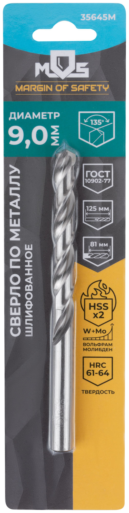 Сверло по металлу HSS 9,0 x 125 мм с углом заточки 135°