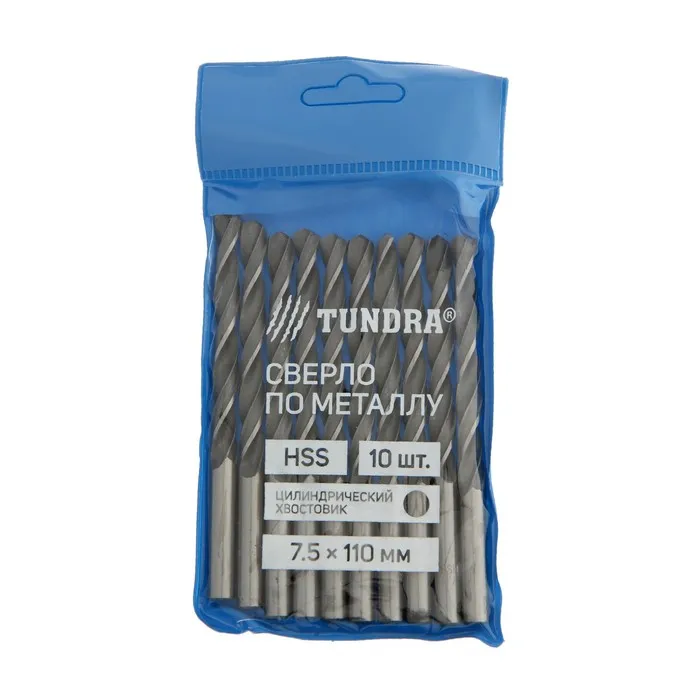 Сверло по металлу ТУНДРА, HSS, цилиндрический хвостовик, 7.5 х 110 мм, 10 шт. — Характеристики