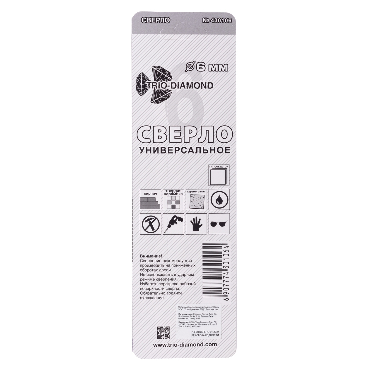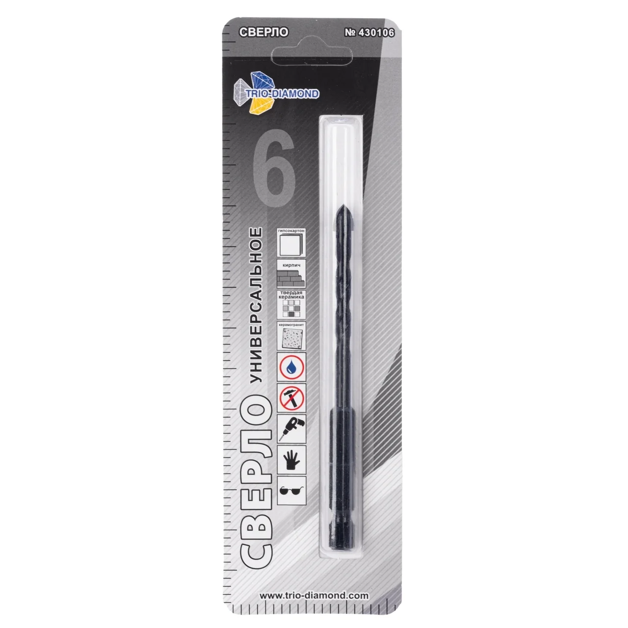 Сверло TRIO-DIAMOND диаметром 6 мм — идеальный инструмент для работы с керамогранитом, керамической плиткой, кирпичом и гипсокартоном. Оно позволяет выполнять точные отверстия, сохраняя структуру материала, что делает его незаменимым при отделочных и ремонтных работах.