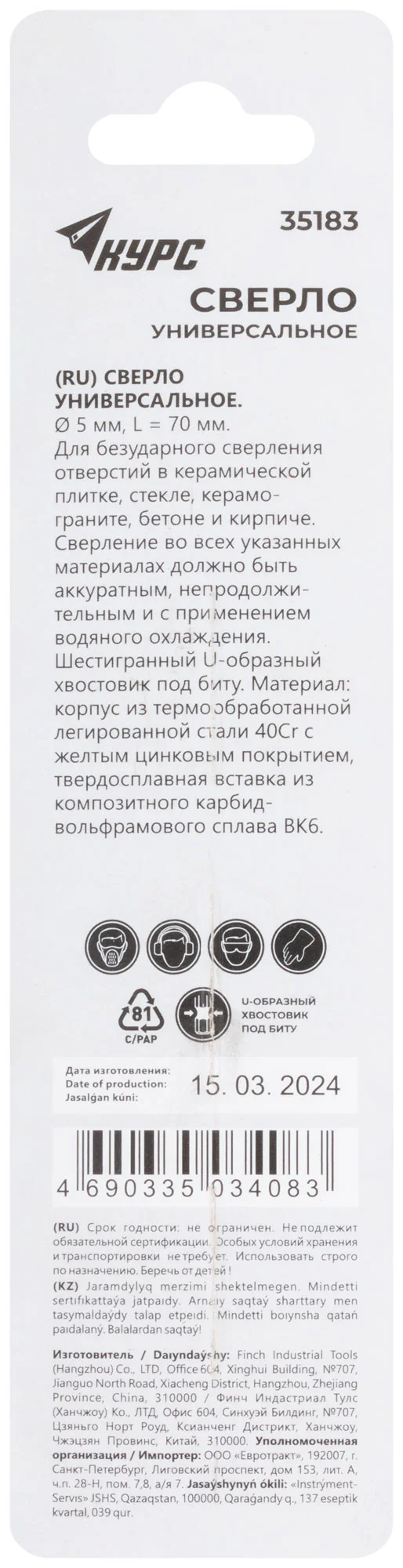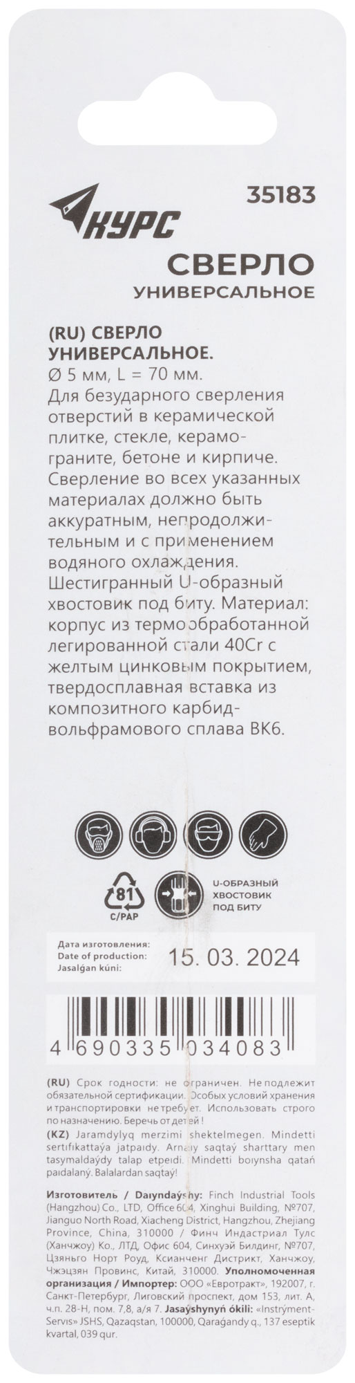 Выберите сверло КУРС 35183, чтобы обеспечить качественное и точное выполнение работ при сверлении различных поверхностей.