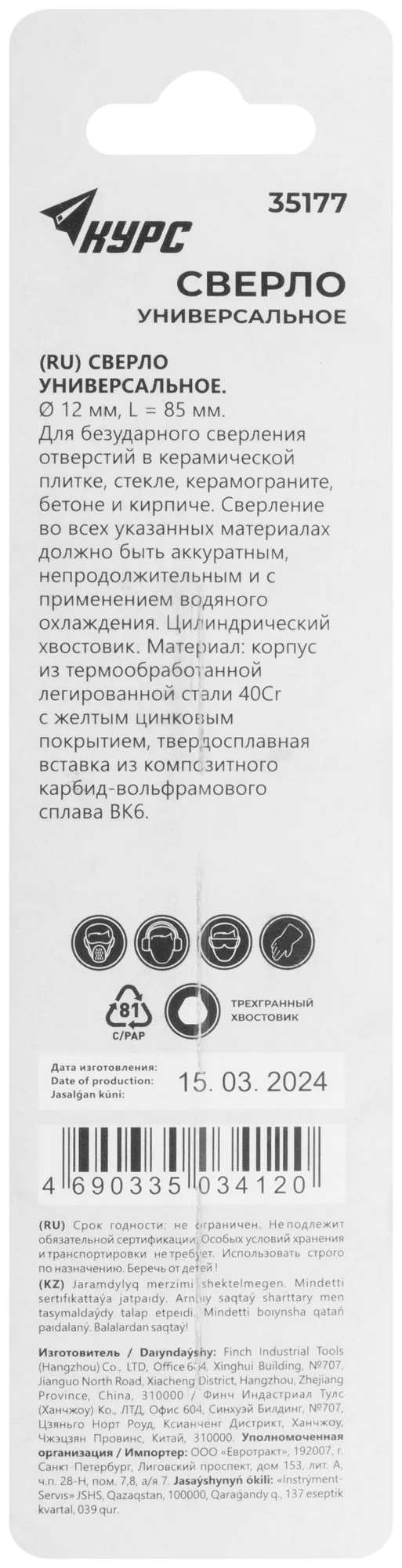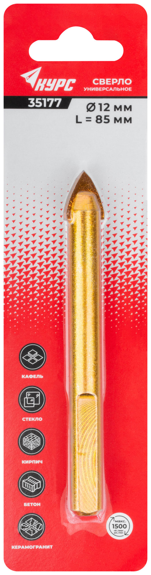 Сверло КУРС диаметром 12 мм и длиной 85 мм предназначено для аккуратного сверления отверстий в керамической плитке, стекле, керамограните, бетоне и кирпиче. Идеально подходит для ситуаций, когда требуется безударное сверление с применением водяного охлаждения.