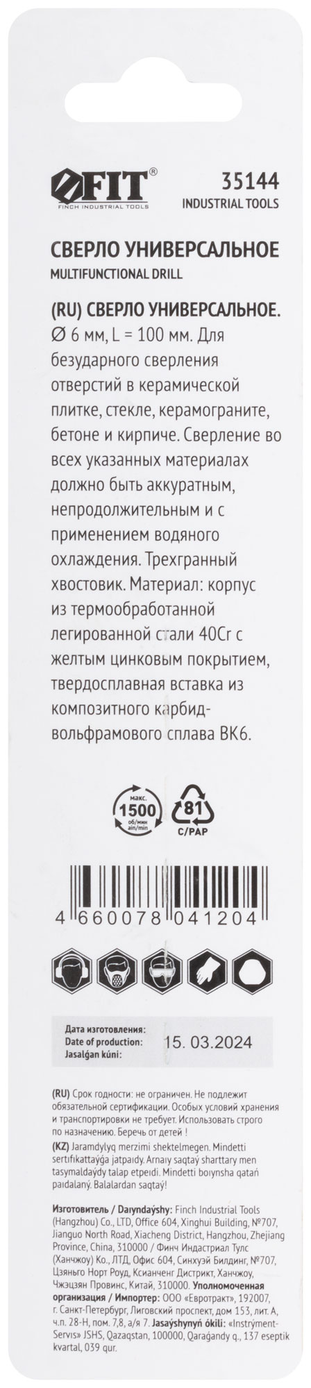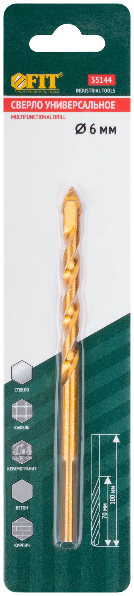 Сверло FIT 35144 идеально подходит для безударного сверления отверстий в керамической плитке, стекле, керамограните, бетоне и кирпиче. Оно помогает мастерам эффективно выполнять работы по установке и отделке, когда требуется аккуратное сверление без повреждений материала.