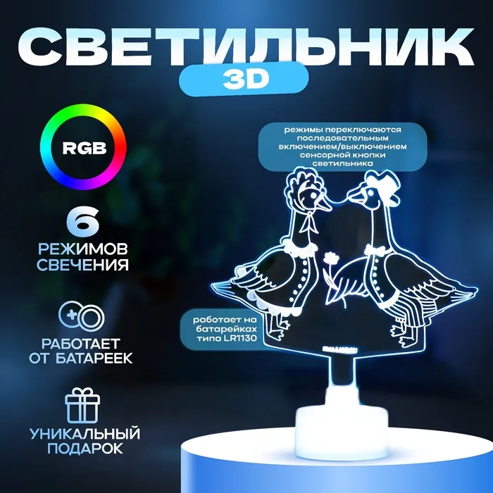 Светильник 3D ночник RISALUX «Гуси», LED RGB 6 цветов, от батареек LR1130 3 шт., 11×9.5 см — Характеристики