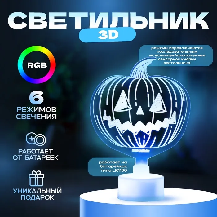 Светильник 3D ночник RISALUX «Тыква», LED RGB 6 цветов, от батареек LR1130 3 шт., 8×9.5 см — Характеристики