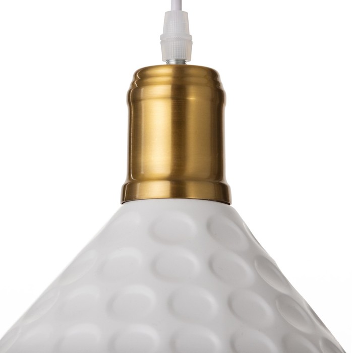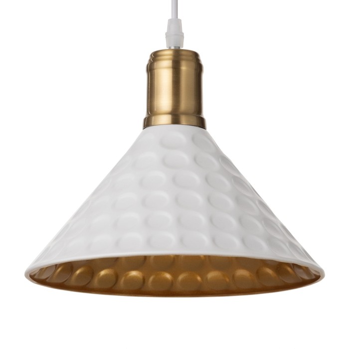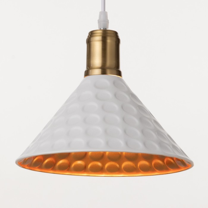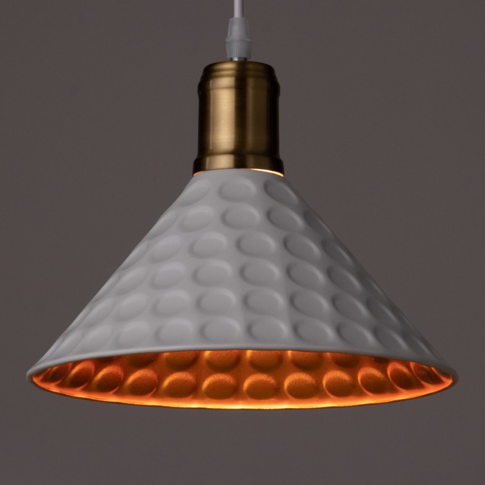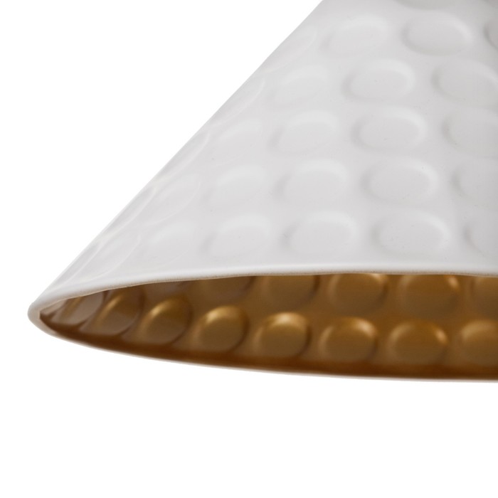 - Выразительный дизайн: Плафон в форме перевернутого конуса выполнен из металла с текстурой «чеканка». Такая поверхность создает интересную игру света и тени. Бело-золотая палитра гармонично сочетается с кирпичной кладкой, бетоном и деревом.