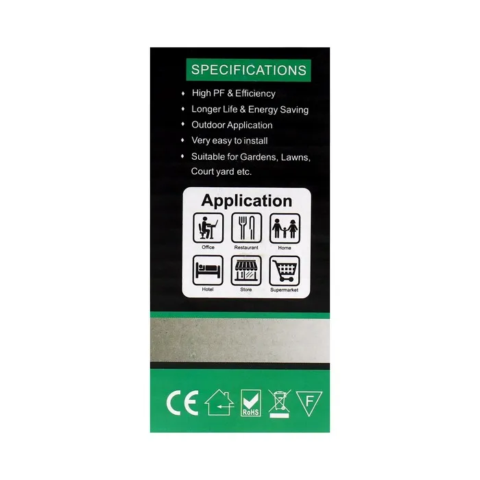 Светильник излучает тёплый белый свет с цветовой температурой 3000К, создавая мягкое и приятное освещение, которое идеально подходит для использования на верандах, в садах или у входных дверей. Его пластиковый корпус чёрного цвета добавляет интерьеру современности и элегантности.