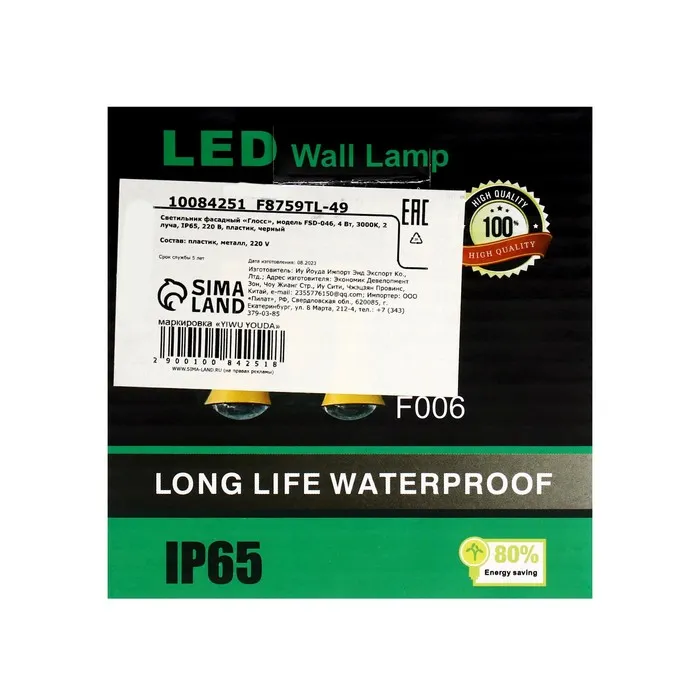 - Безопасность: степень защиты IP65 обеспечивает устойчивость светильника к пыли и влаге, что делает его идеальным для использования на улице в любых погодных условиях.