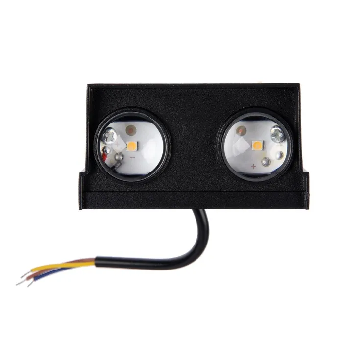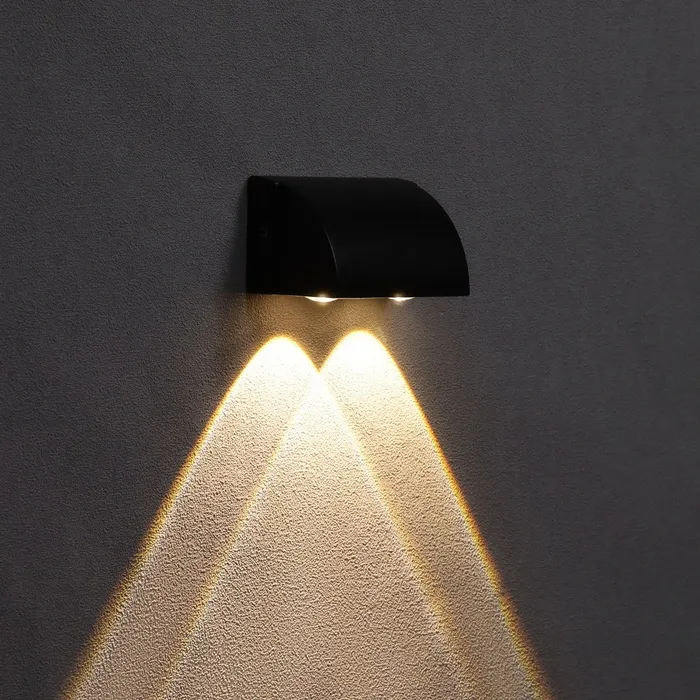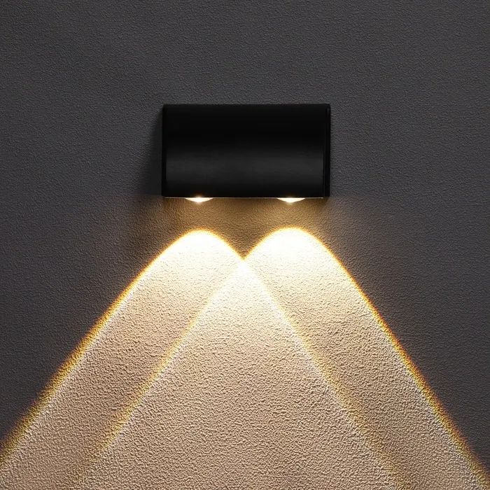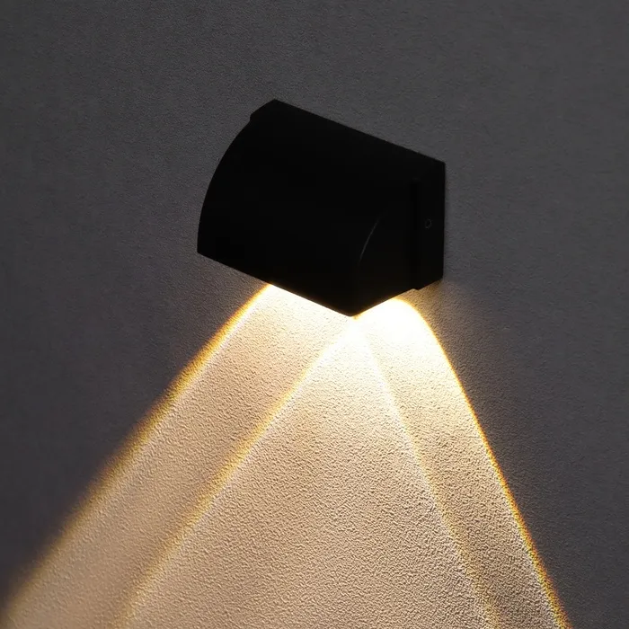 Светильник выполнен в форме каскада, что придает ему элегантный и современный вид. Чёрный корпус из прочного металла гармонично вписывается в любой экстерьер, а два луча света создают мягкое и равномерное освещение. Благодаря встроенным светодиодам и цветовой температуре 3000 К, светильник излучает теплый белый свет, создавая уютную атмосферу.