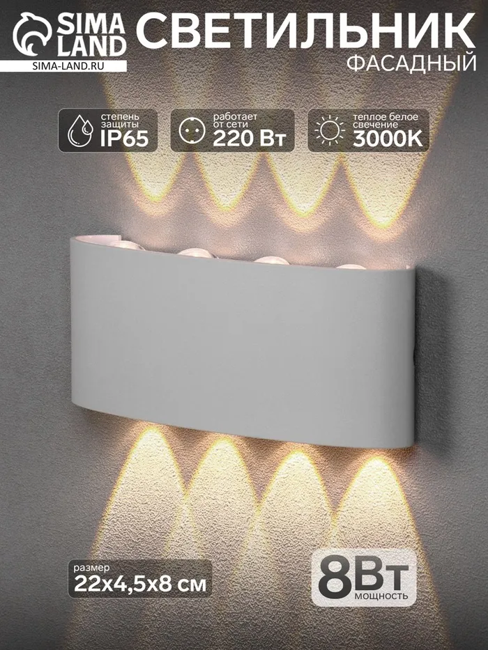 Светильник фасадный «Полусфера», 8 Вт, 3000К, 4 луча, IP65, 220 В, пластиковый корпус, белый, свечение тёплое белое — Характеристики