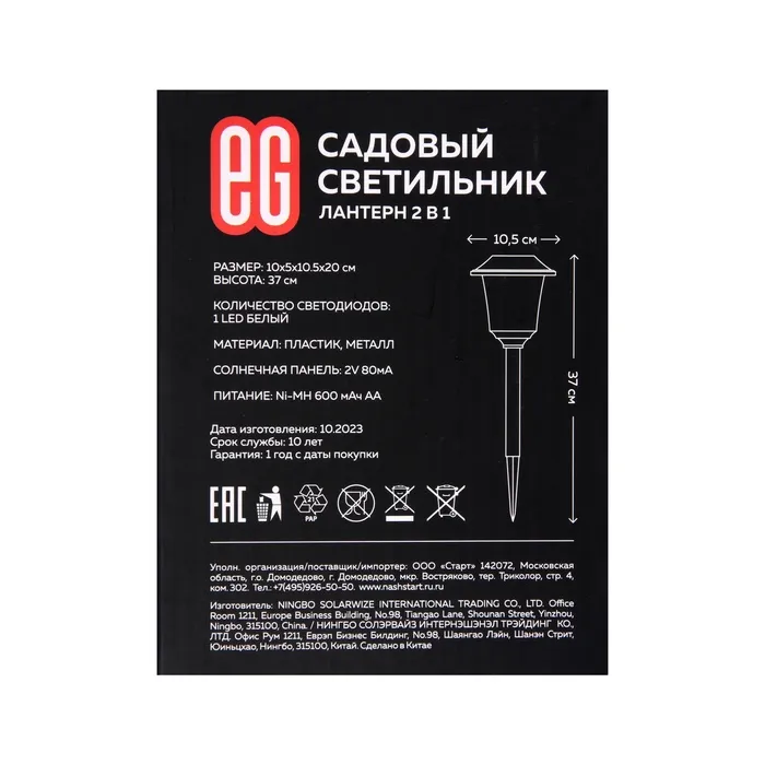 Светильник на солнечной батарее "Еврогарант", "Фонарь" 10.5x37 см, IP44, 1 LED, Т/БЕЛЫЙ — Характеристики