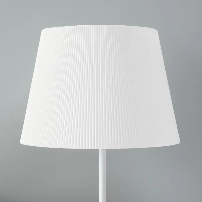 - Трапециевидный абажур из текстиля и пластика обеспечивает мягкое и комфортное освещение, направленное вверх.