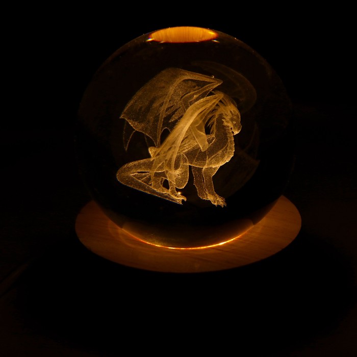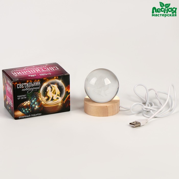Диаметр шара 6 см.Размер подставки 6 х 6 х 2 см.Длина провода 1 м.Основа выполнена из экологически чистого материала - дерева, поэтому крепкая и долговечная.В светильник встроено 6 светодиодов, которые работают от USB.