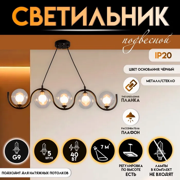 Светильник подвесной BayerLux «Волна», E27 15 Вт, прозрачный, 40×40×18 (+60) см — Характеристики