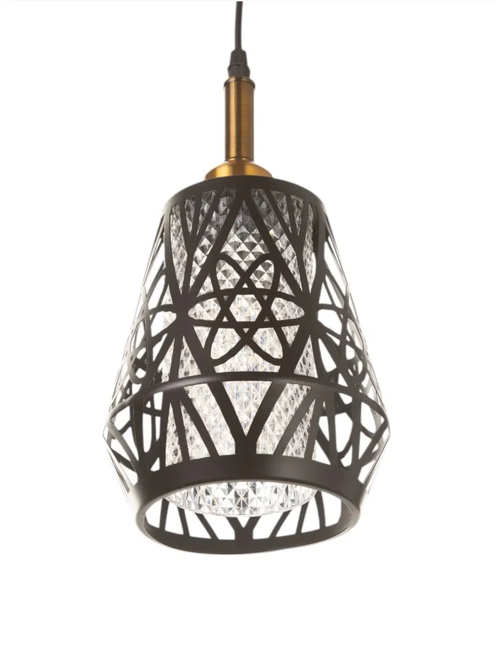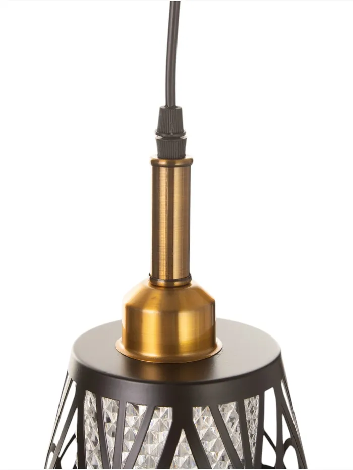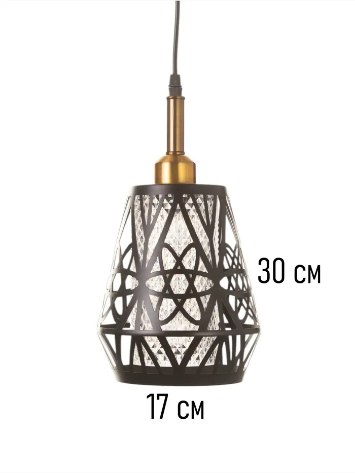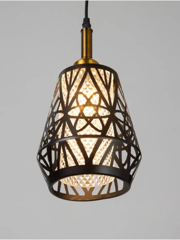 - Оригинальный дизайн: комбинация чёрного и золотого цветов делает светильник визуально привлекательным и уместным в различных интерьерах. Геометрический узор плафона подчёркивает стиль и характер изделия.