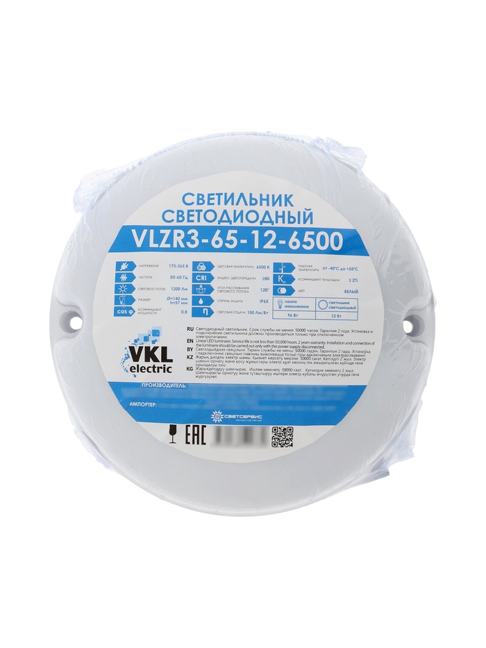Светильник светодиодный VKL Electric герметичный, 12 Вт, 1200 лм, IP65, 6500К, круглый, белый — Характеристики