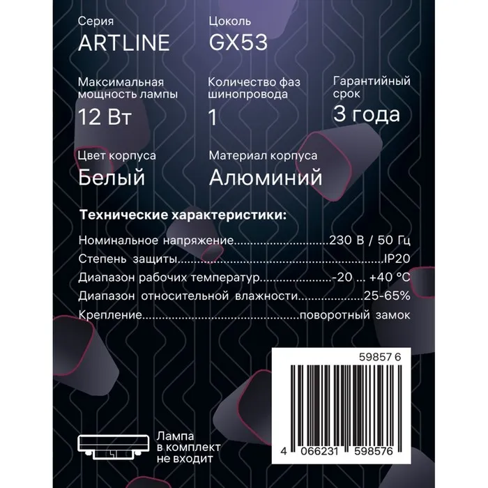 Светильник трек-й ARTLINE повор-й 85x55mm GX53 230В алюм 4м² бел 59857 6 Ritter — Характеристики