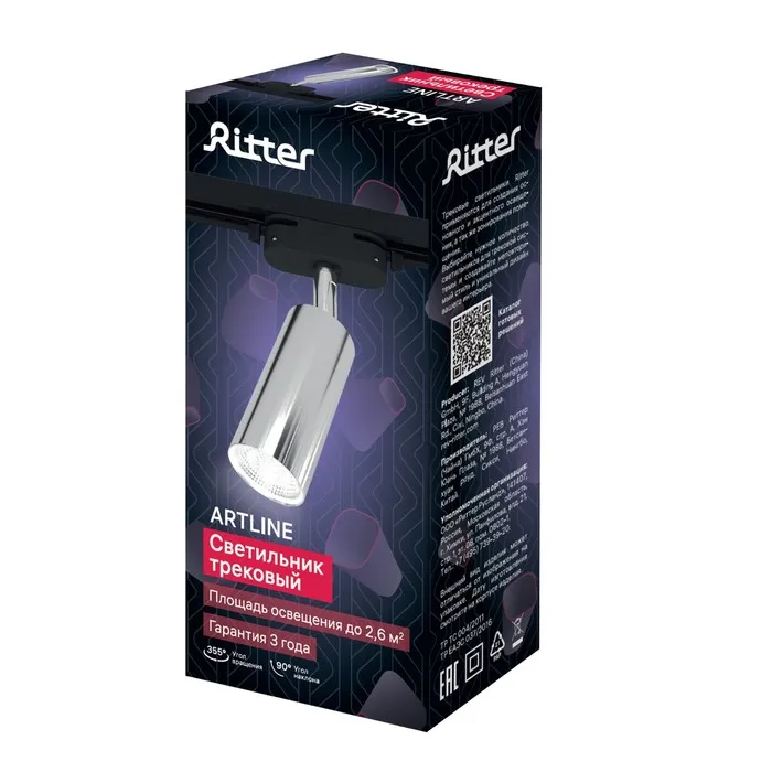 Светильник трековый Ritter ARTLINE, поворотный, GU10, 55х100 мм, 230В, площадь до 2,6 м² , хромированный — Характеристики