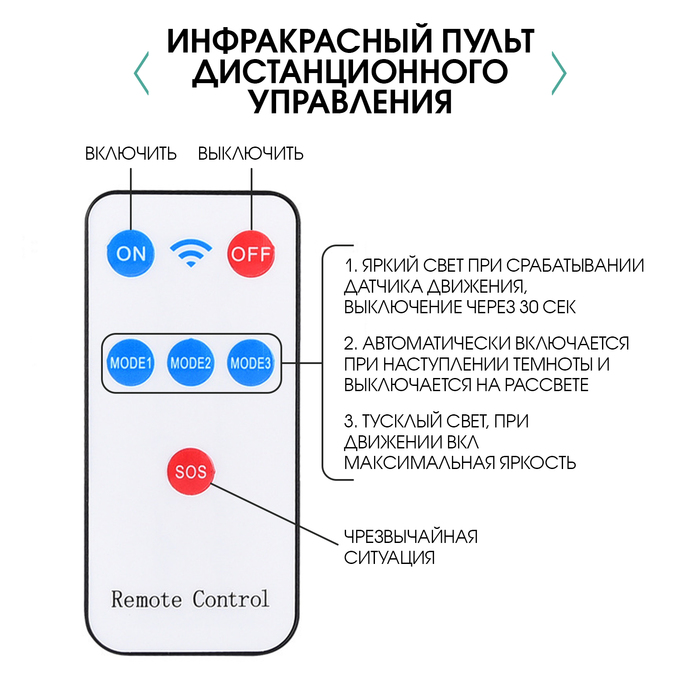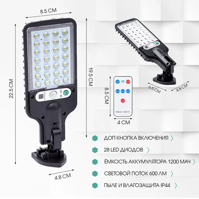 Уличный настенный светодиодный фонарь с аккумулятором, работающий от солнечной энергии. Корпус фонаря сделан из прочного и долговечного ABS-пластика. Фонарь оснащен 28 яркими LED-диодами и имеет световой поток яркостью 600 люмен. Размер фонаря составляет 22.7 x 8.4 x 2 см. Аккумулятор имеет емкость 1200 mAh. В комплекте с фонарем поставляется пульт дистанционного управления для изменения настроек освещения. Поставляется в картонной упаковке.