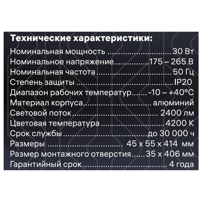 Светильник встраив-й, ARTIN, прямоугольный 414×45х55мм LED 30Вт 2400Лм 4200К Al белый — Характеристики