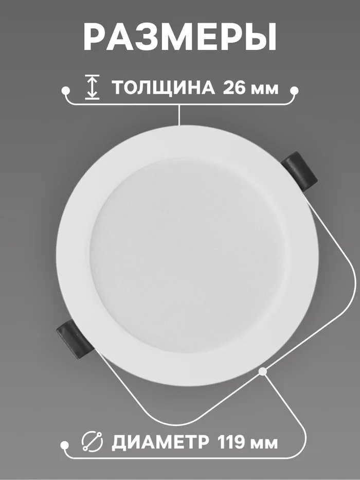 Благодаря компактным размерам (диаметр 119 мм и высота 26 мм) светильник легко встраивается в подвесные или натяжные потолки, сохраняя их элегантность и не нарушая гармонию дизайна. Белый корпус гармонично сочетается с любыми цветовыми решениями, делая его универсальным выбором для дома, офиса или коммерческих помещений.