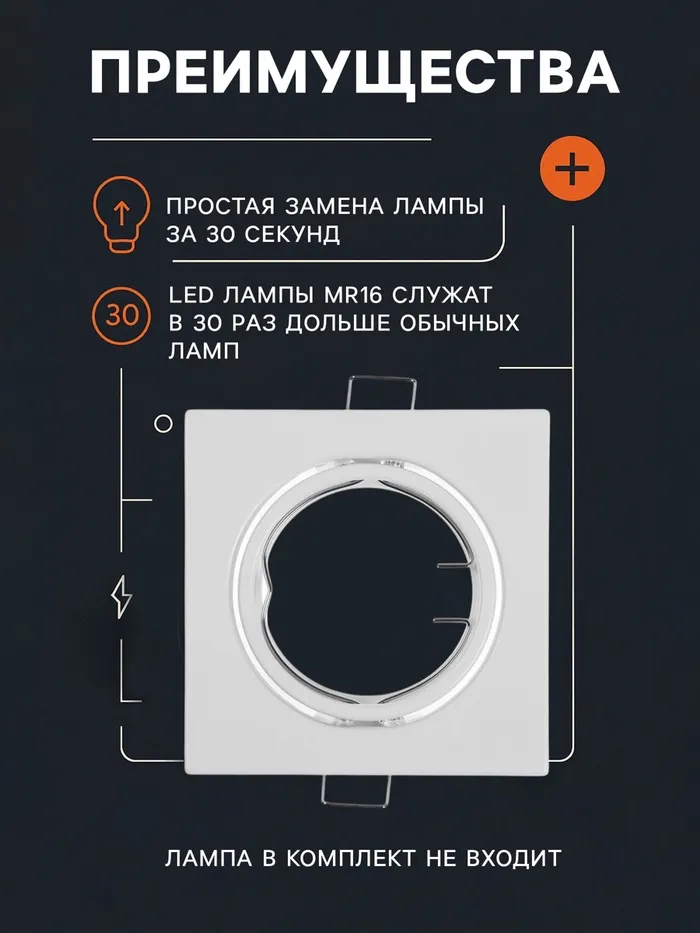 Светильник встраиваемый под лампу MR-16, поворотный, квадратный, металлический, белый — Характеристики