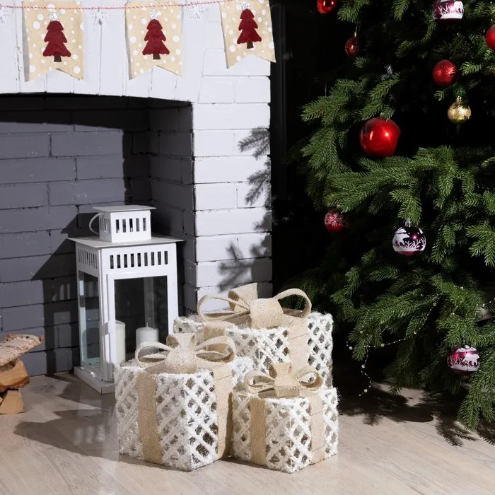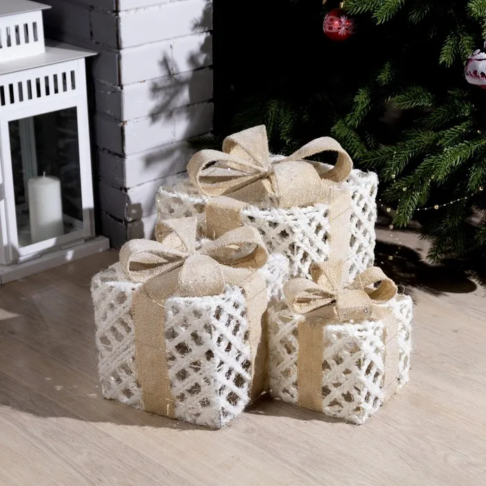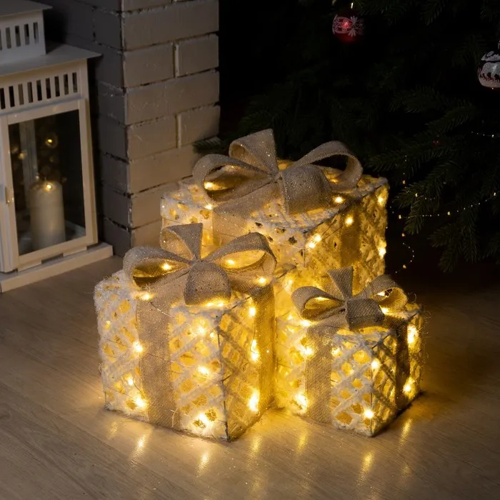 Светодиодная фигура «Ажурные подарки» 15, 20, 25 см, текстиль, металл, батарейки ААх2 (не в комплекте), свечение тёплое белое — Характеристики