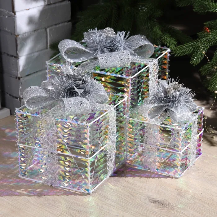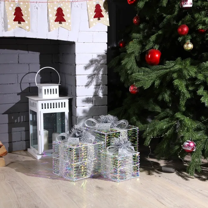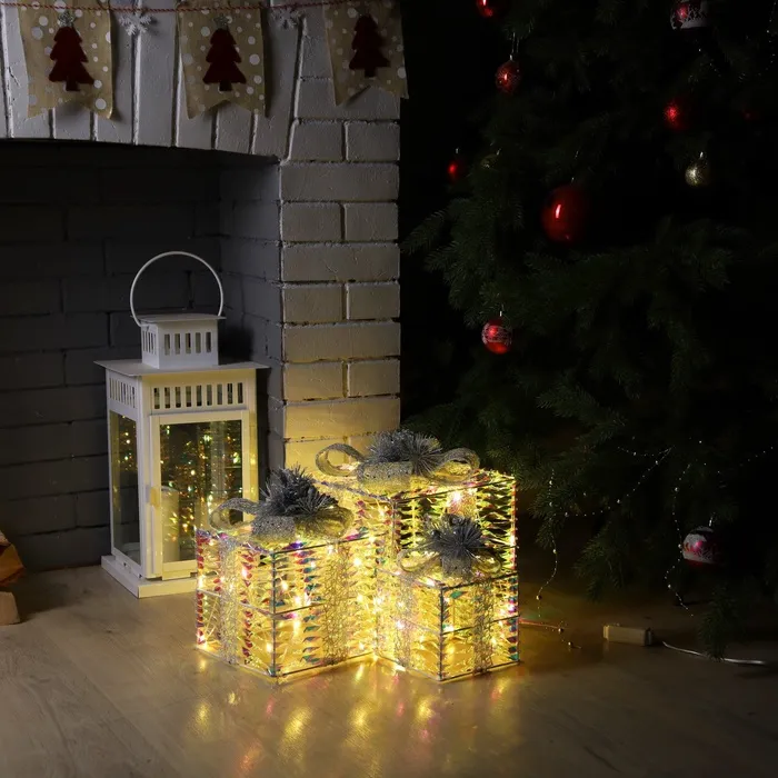 Светодиодная фигура «Блестящие подарки» 15, 20, 25 см, текстиль, металл, 220 В, свечение тёплое белое — Характеристики