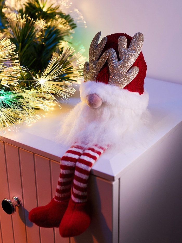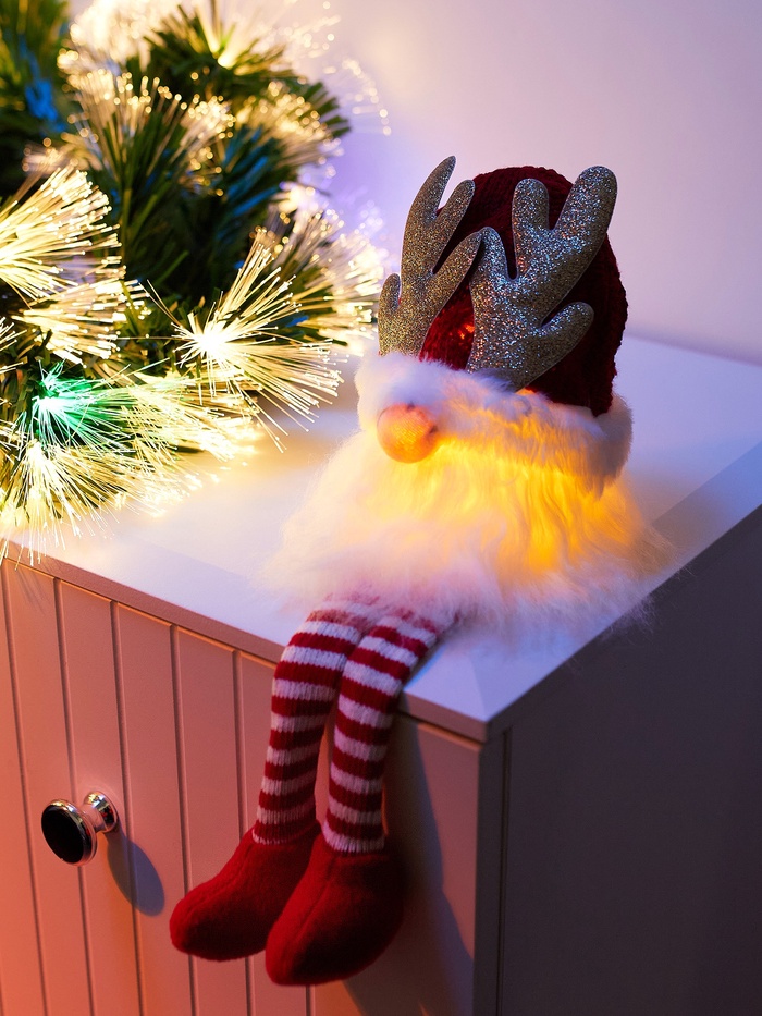 Перед вами очаровательный праздничный аксессуар высотой 33 см — текстильный гном в красной шапочке, излучающий мягкий тёплый свет благодаря светодиоду. Его работа основана на постоянном свечении.