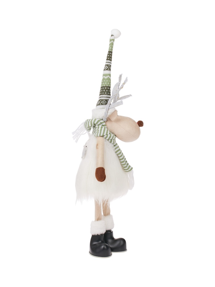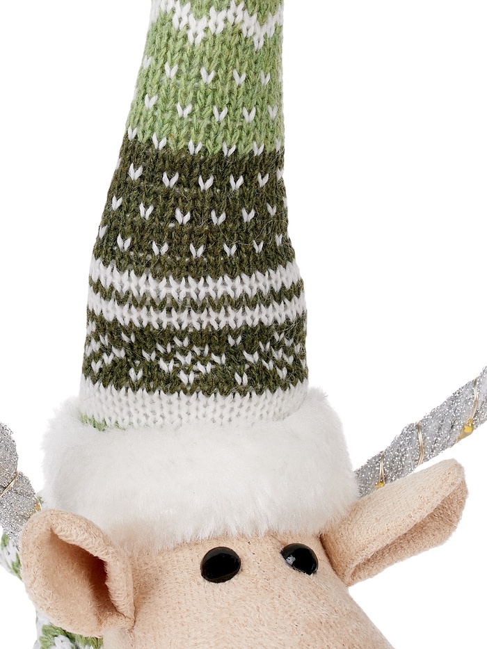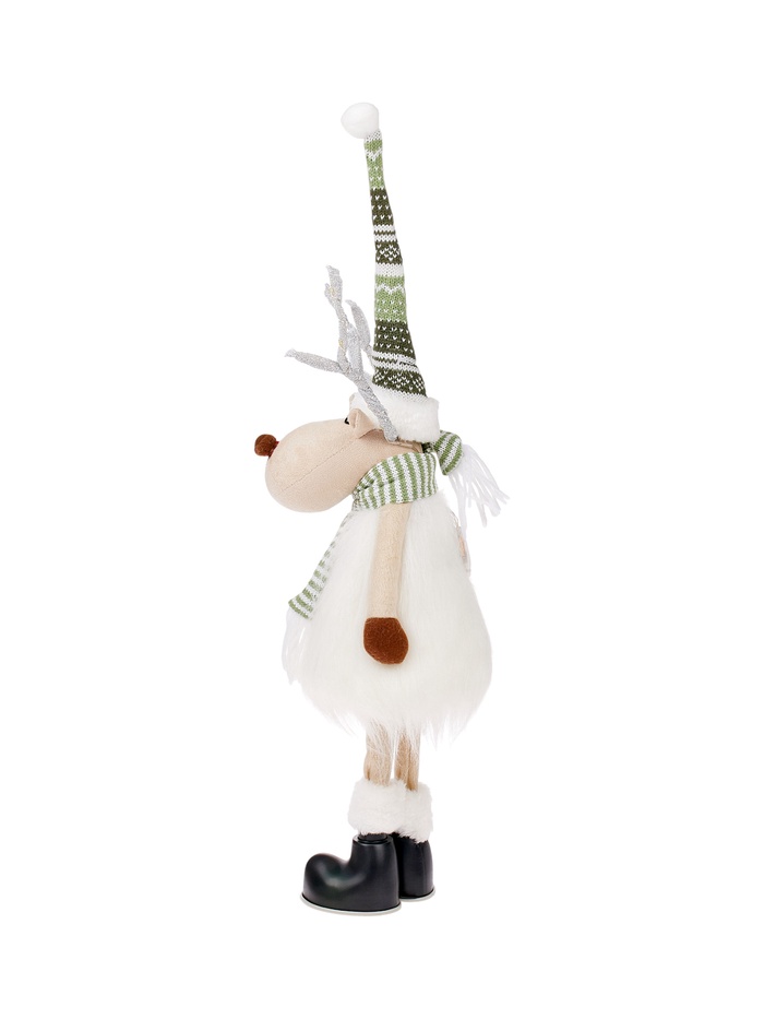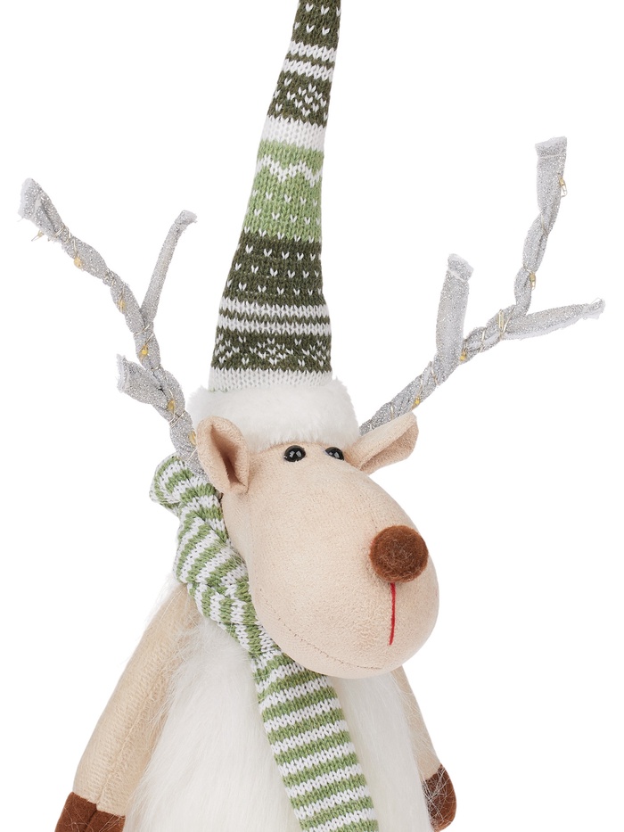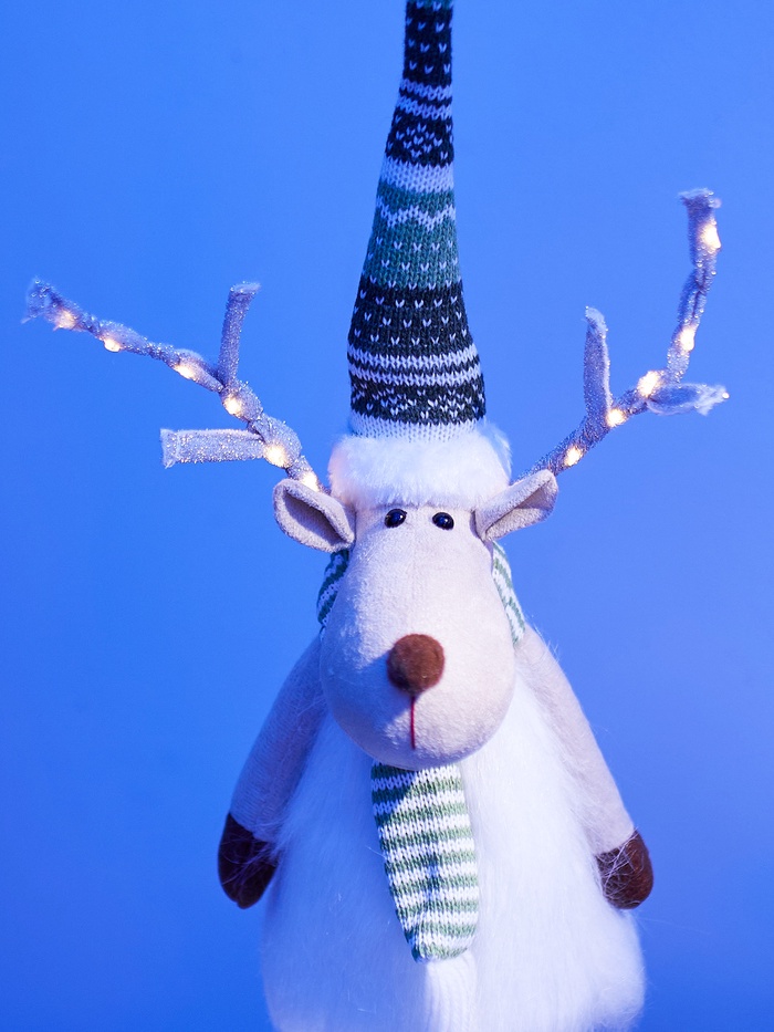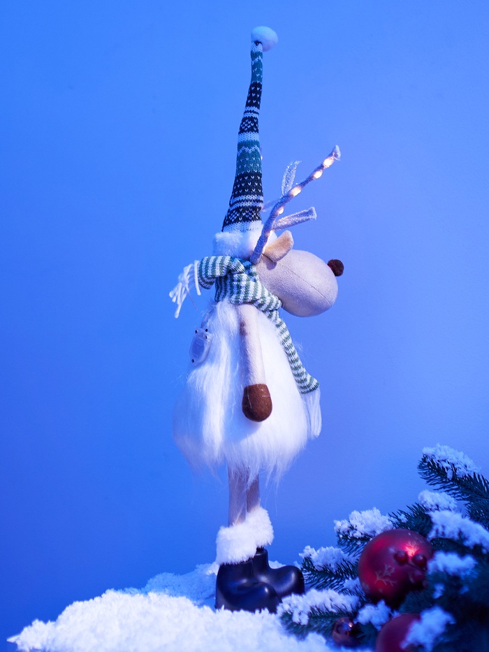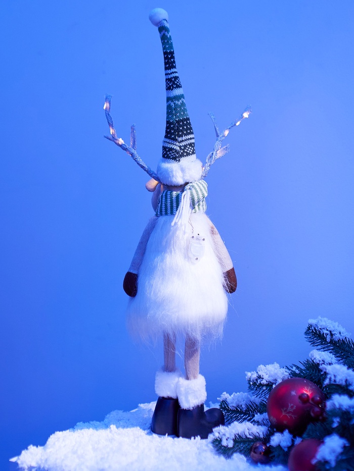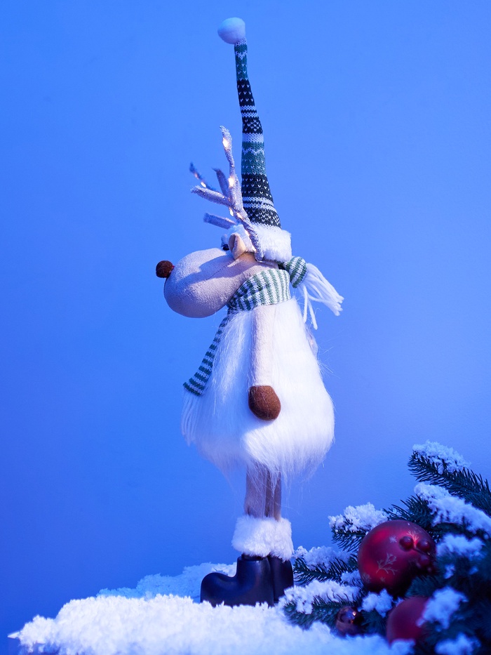 Текстильная фигура «Новогодний лосик» высотой 58 см дарит очарование зимнего леса и уютное световое настроение. Оснащённая 10 светодиодами, она испускает тёплый белый свет, создавая мягкое, праздничное сияние без резкости. Благодаря питанию от батарейки CR2032, фигуру можно разместить практически везде — на полке, столе или среди рождественской композиции, без необходимости подключения к сети.