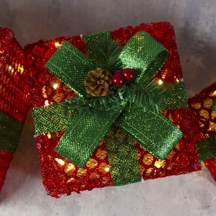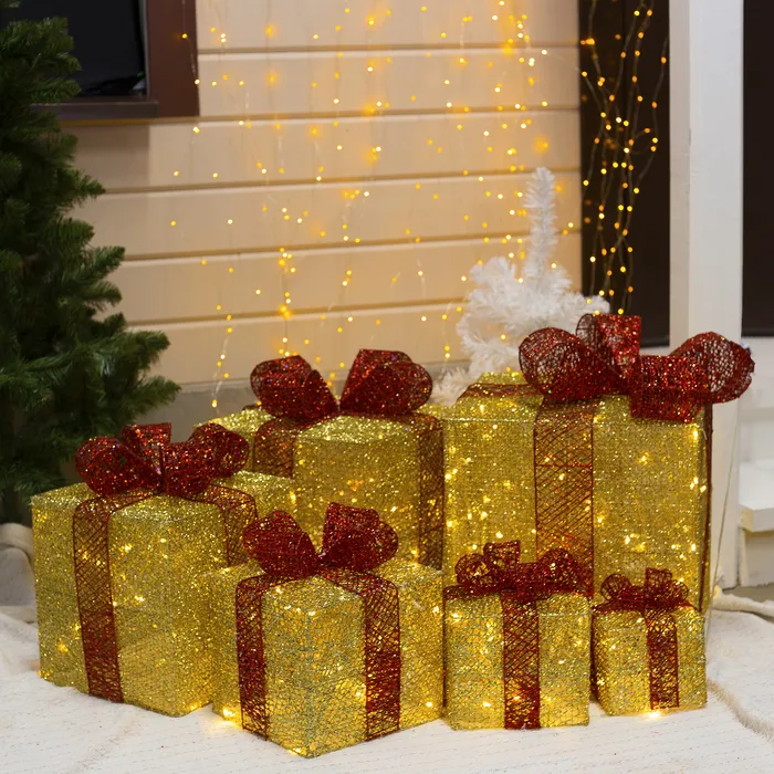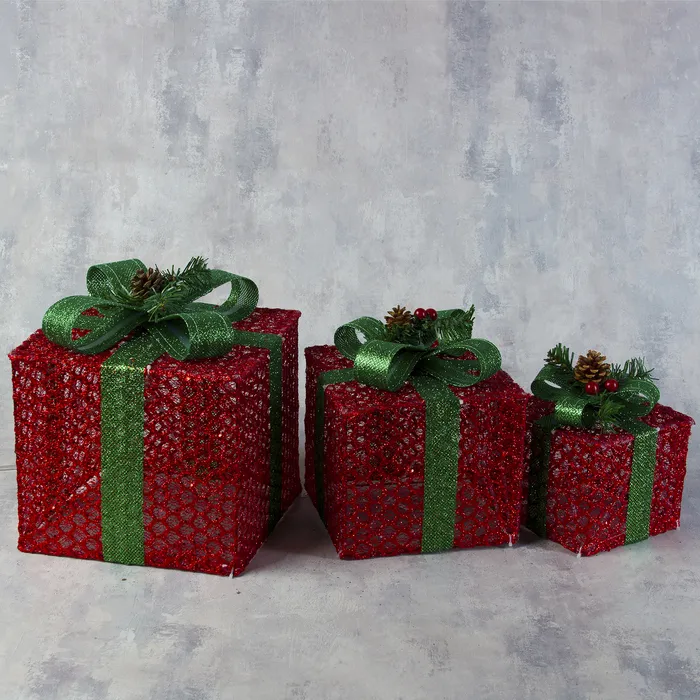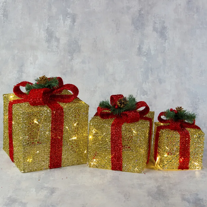 Светодиодная фигура «Подарки с зелёной лентой» 15, 20, 25 см, текстиль, металл, 220 В, свечение тёплое белое — Характеристики