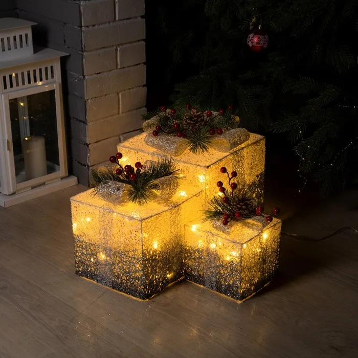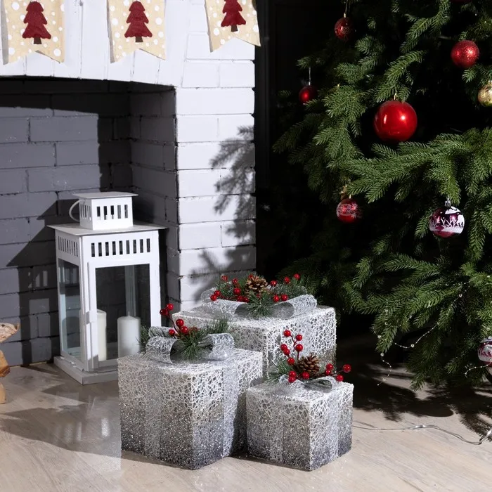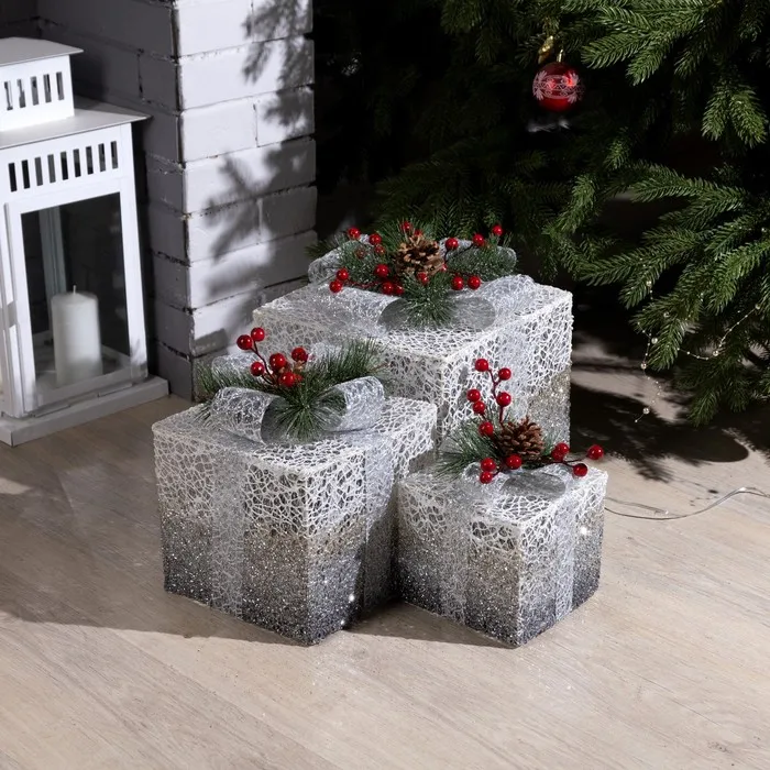 Светодиодная фигура «Серебристые подарки» 15, 20, 25 см, текстиль, металл, 220 В, свечение тёплое белое — Характеристики