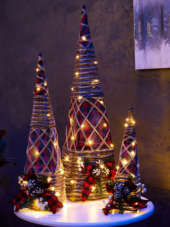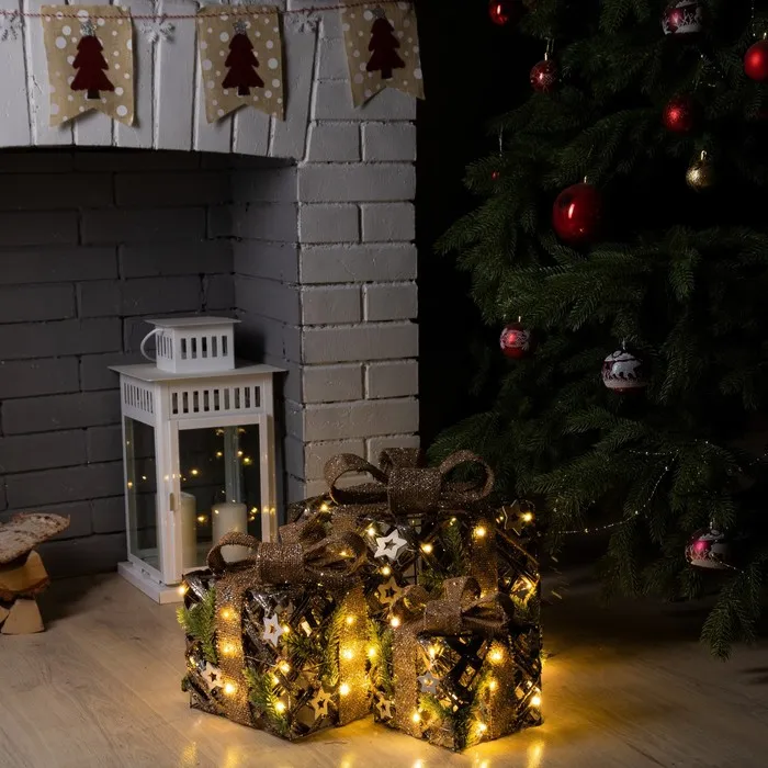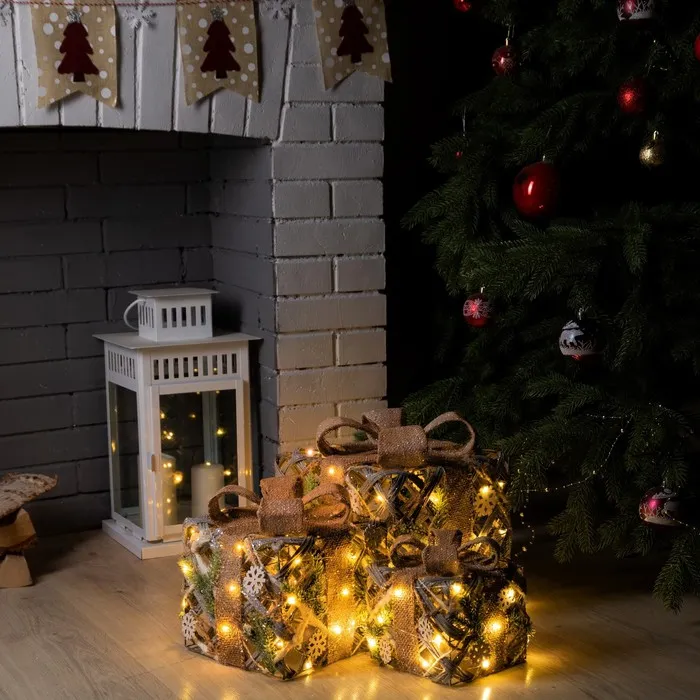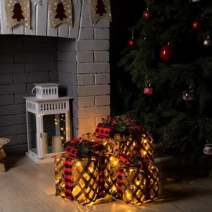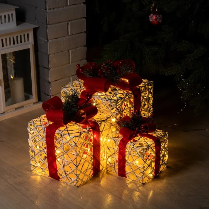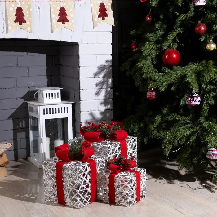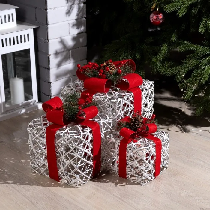 Светодиодная фигура «Серебристые подарки с красной лентой» 15, 20, 25 см, текстиль, металл, 220 В, свечение тёплое белое — Характеристики