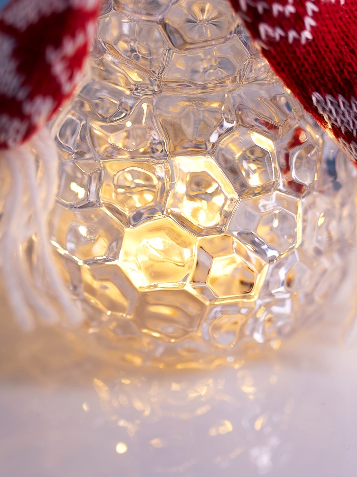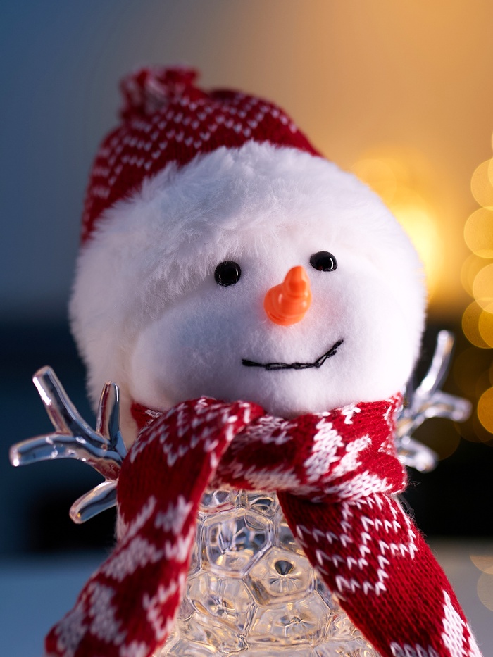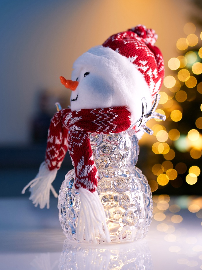 Разместите снеговика на подоконнике, полке, прихожей или в композиции с ёлочными украшениями — он станет мягким источником уюта и света, при этом не требует особого ухода.