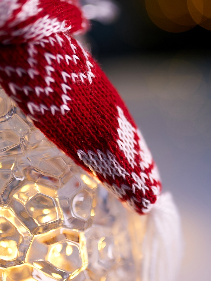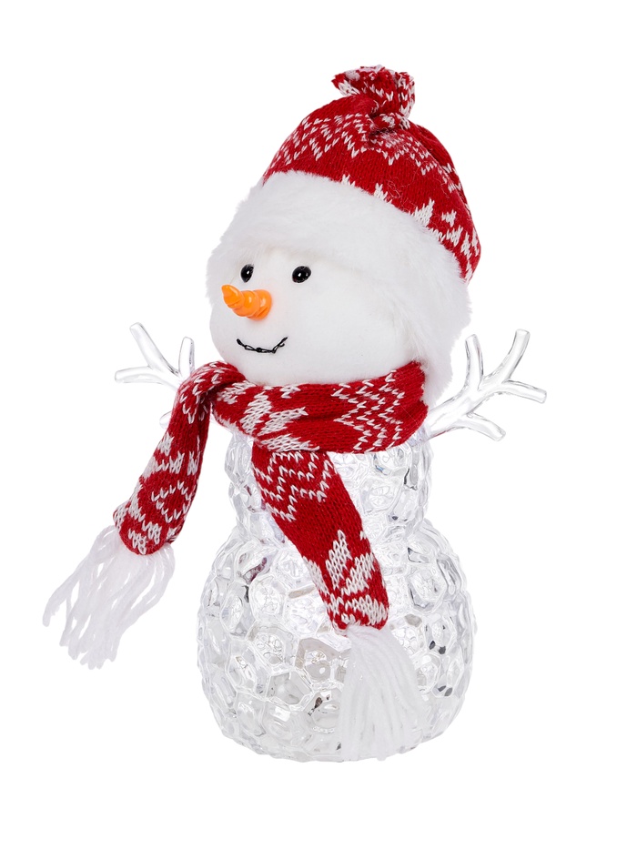 Небольшая, но выразительная фигура высотой 28 см — снеговик с красной шапочкой и шарфом, который аккуратно подсвечивает пространство мягким тёплым светом. Светодиод создаёт ровное освещение без мерцания, придавая интерьеру нежную праздничную ауру.