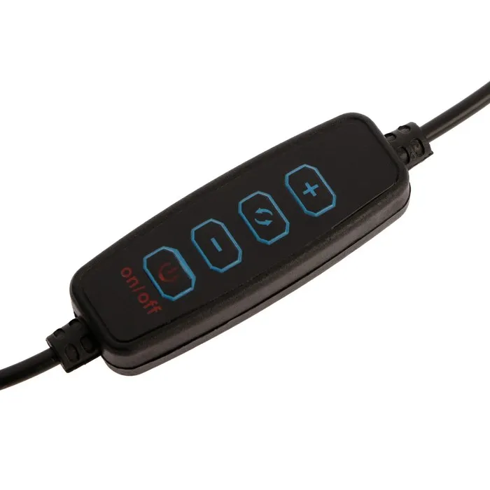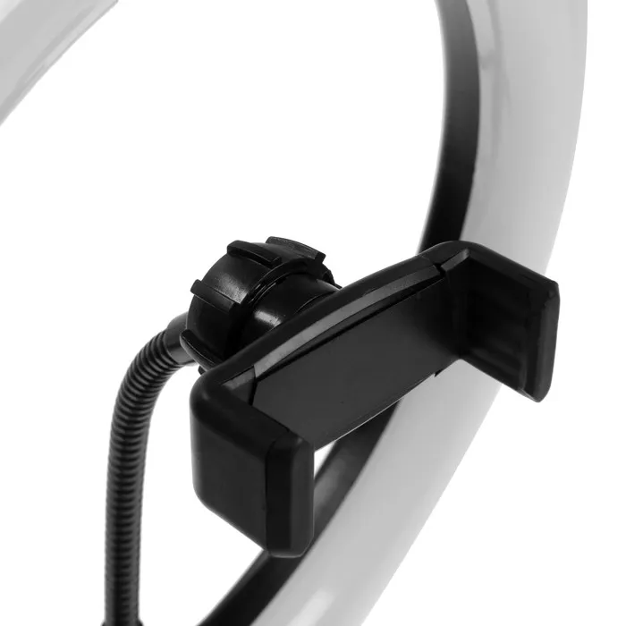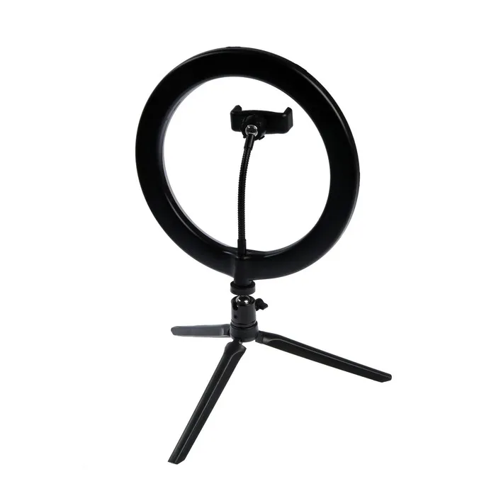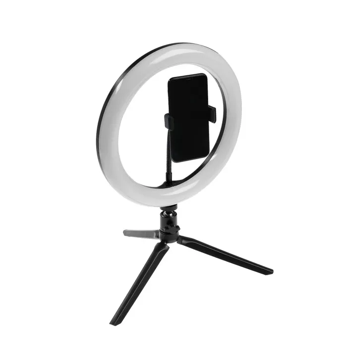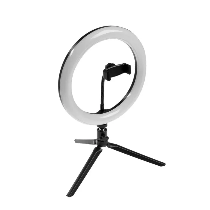 Светодиодная кольцевая лампа на штативе от LuazON поможет создать равномерное освещение для съёмок фото и видео. Штатив позволяет зафиксировать смартфон и регулировать его угол наклона. Для работы подключите устройство к адаптеру питания или к USB-розетке. Меняйте режимы и изменяйте яркость с помощью пульта на проводе.