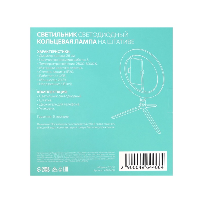 Светодиодная кольцевая лампа на штативе Luazon CB-31, 10" (26 см), 20 Вт, 3 режима, USB — Характеристики