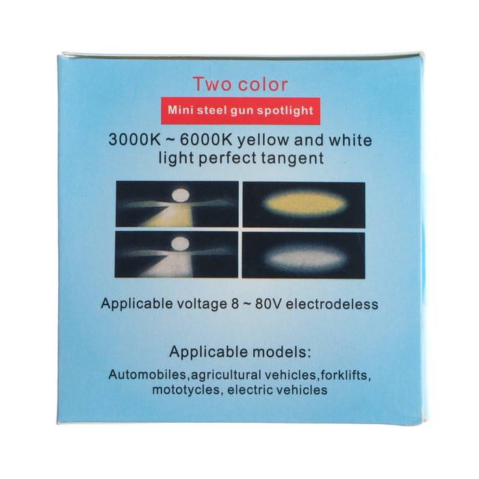 Это автомобильная светодиодная фара, которая имеет степень защиты от пыли и влаги IP67. Она может работать от напряжения от 12 до 80 вольт и имеет два режима работы: ближний свет (желтый) и дальний свет (белый). Мощность фары составляет 20 ватт.