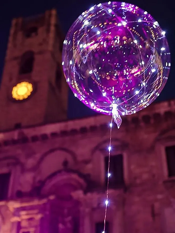 Поместить внутрь шара. Надуйте воздушный шар воздухом и сдуйте. Проденьте светодиодную ленту через трубочку для шаров, остатки ленты поместите внутрь шара. Надуйте его гелием, перевяжите и закрепите в держателе и трубочке для шаров.