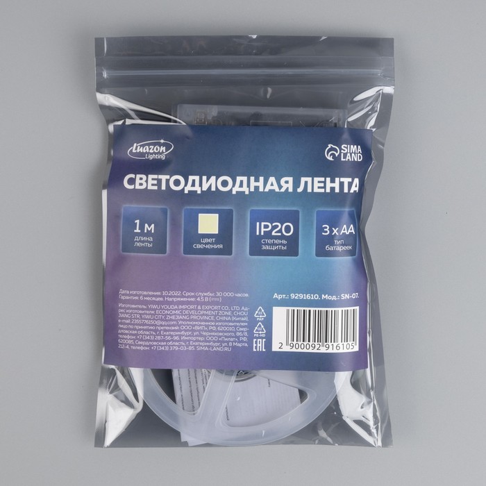 Светодиодная лента Luazon Lighting 1 м, IP20, SMD2835, 30 LED/м, 3хААА, 3000К — Характеристики