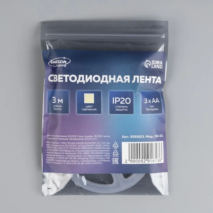 Светодиодная лента Luazon Lighting 3 м, IP20, SMD2835, 30 LED/м, 3хААА, 3000К, свечение тёплое белое — Характеристики