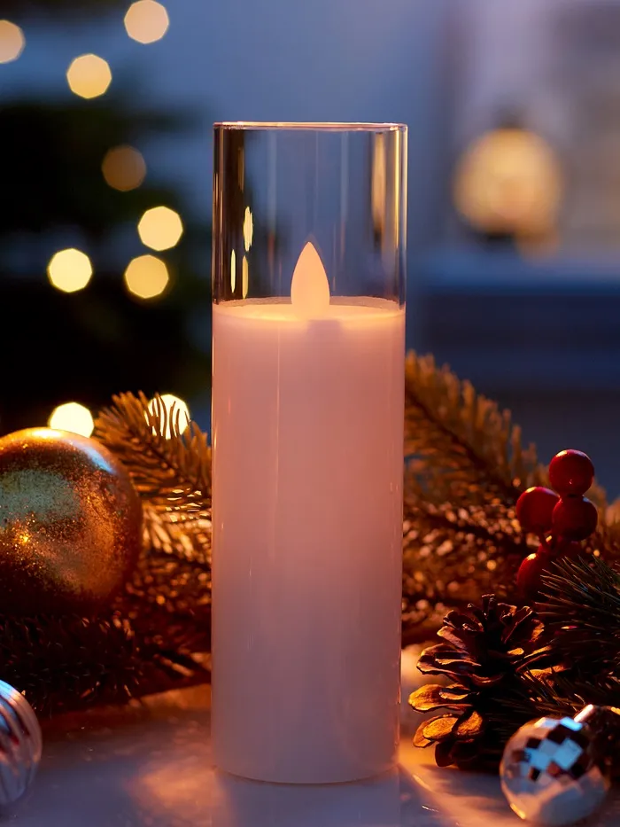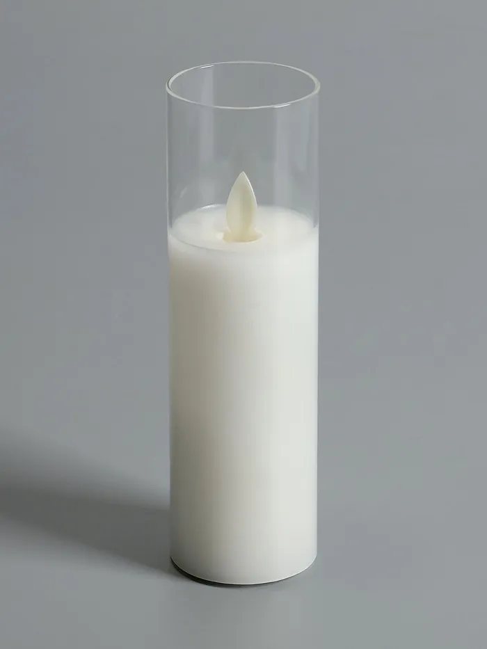 Белоснежная светодиодная восковая свеча в прозрачном стакане создаёт атмосферу спокойствия и уюта, идеально вписываясь в любой интерьер. Её классическая цилиндрическая форма и высота 18 см делают изделие универсальным решением для оформления домашнего пространства, ресторанов или праздничных мероприятий.