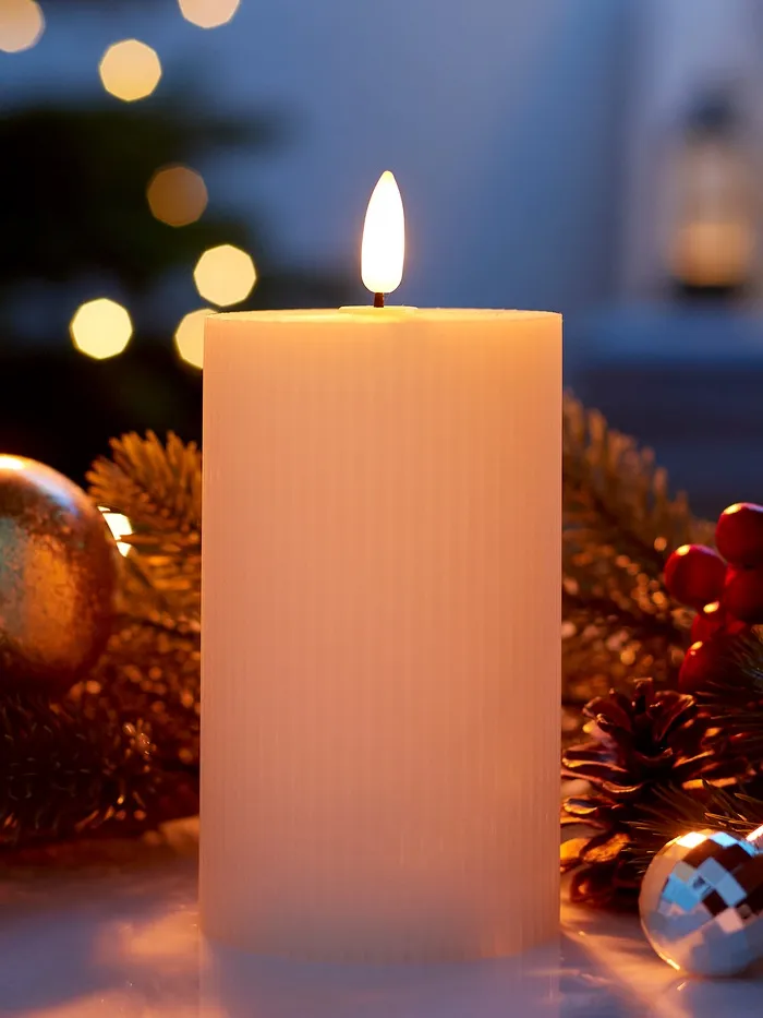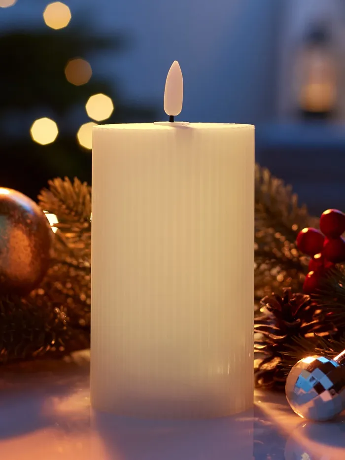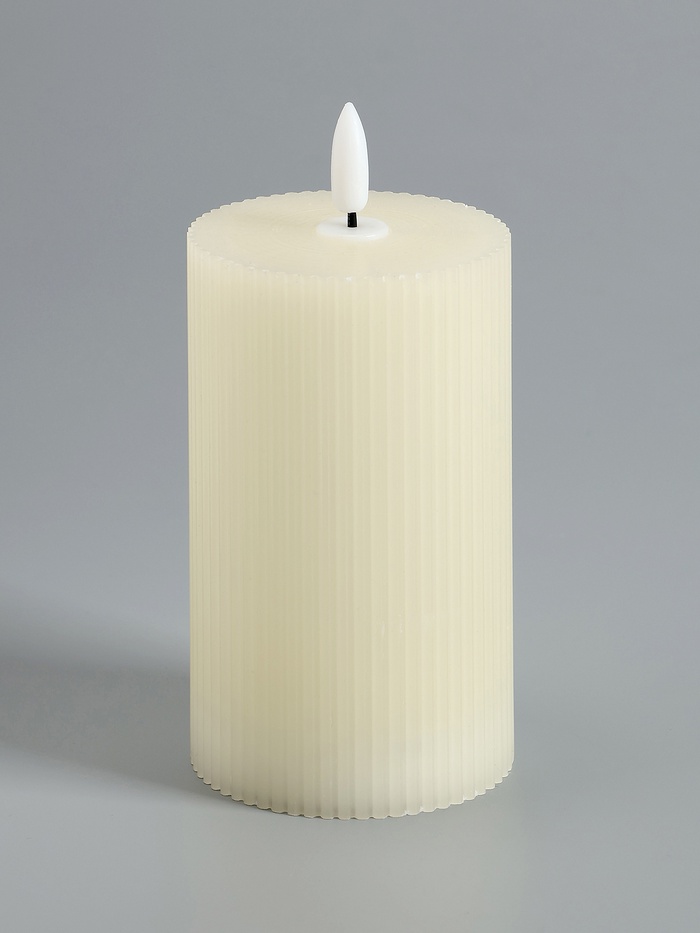 Элегантная белая светодиодная свеча с рифлёной поверхностью имеет выразительный и изысканный вид, она станет стильным акцентом в вашем интерьере. Компактные размеры 15 × 7 см позволяют легко разместить её на столе, полке или в праздничной композиции.
