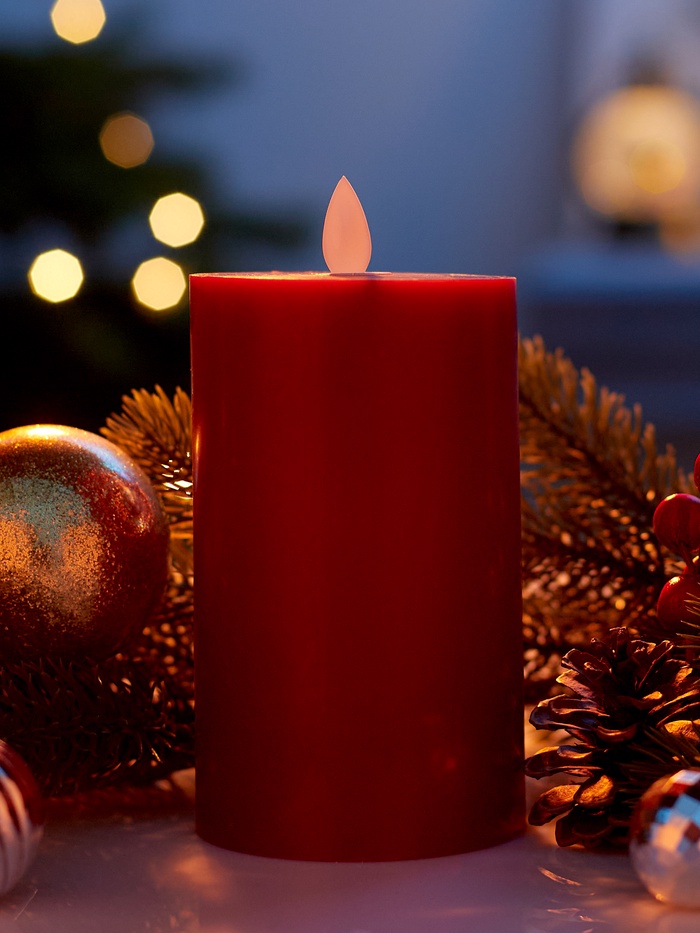 Глубокий красный оттенок этой восковой светодиодной свечи создаёт атмосферу тепла и уюта, идеально вписываясь в интерьер любого стиля. Её цилиндрическая форма высотой 15 см придаёт классическую элегантность, а тёплое белое свечение наполняет пространство мягким, расслабляющим светом.