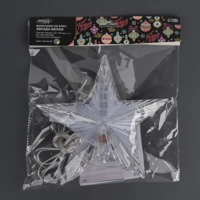 Светодиодная верхушка на ёлку «Звезда белая» 22 см, 30 LED, провод 2 метра, 220 В, свечение мульти — Характеристики
