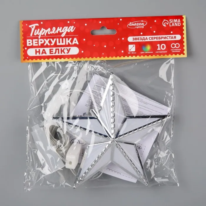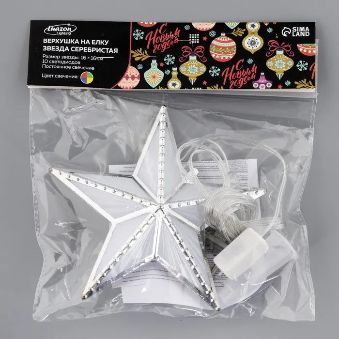 Светодиодная верхушка на ёлку «Звезда серебристая» 16 см, 10 LED, провод 2 метра, 220 В, свечение мульти — Характеристики
