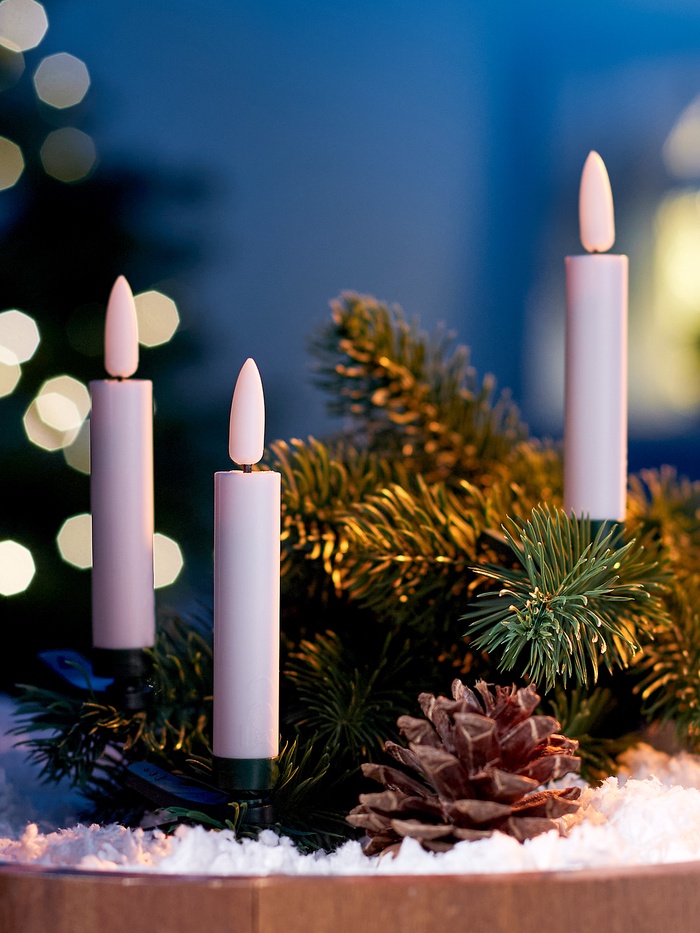 Каждая свеча оснащена светодиодом, который обеспечивает стабильное и равномерное свечение тёплого белого цвета. Питание от батареек типа AAA (LR03) гарантирует длительную работу, а пульт дистанционного управления позволяет легко включать и выключать набор, управлять свечами из любого уголка комнаты без лишних усилий.